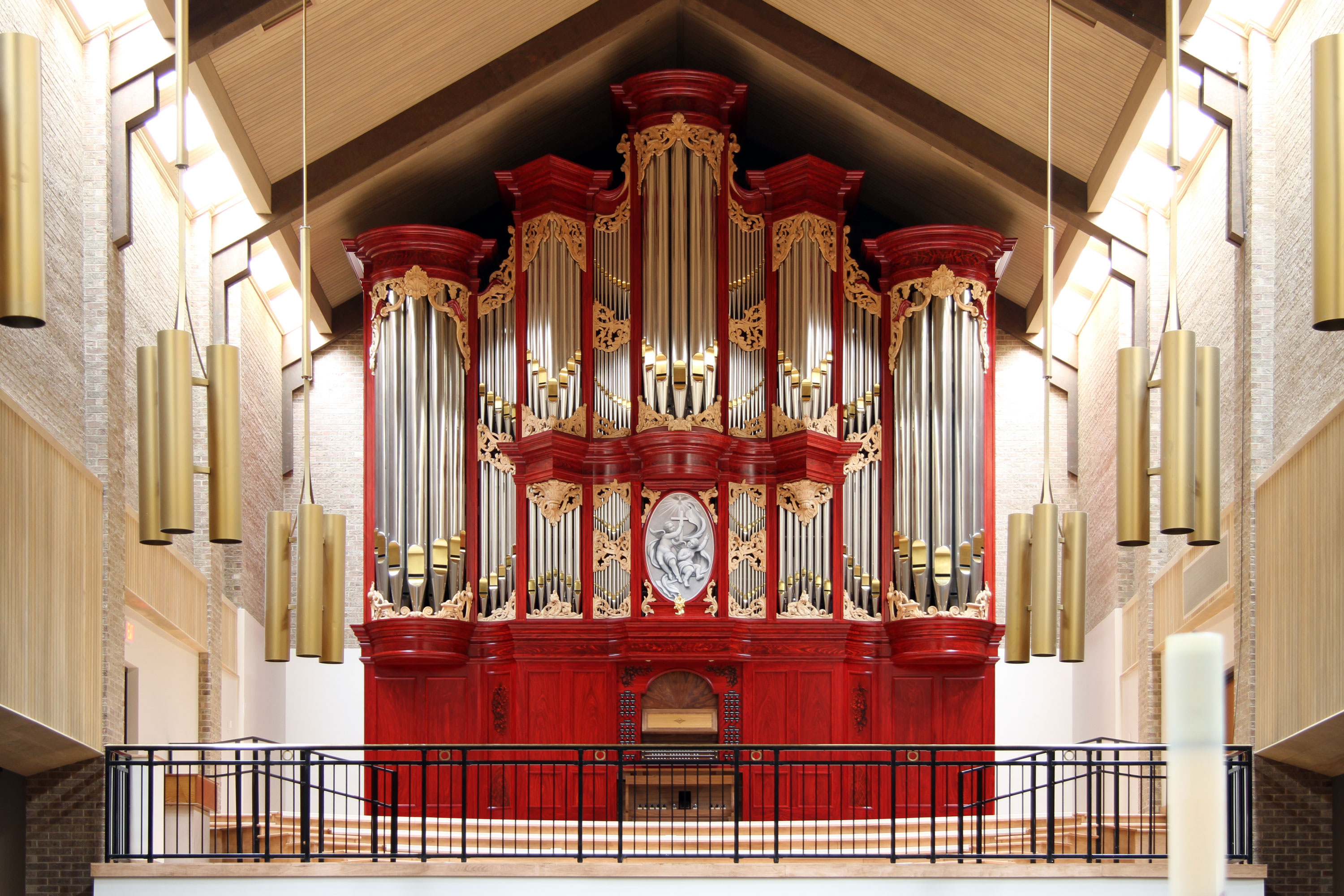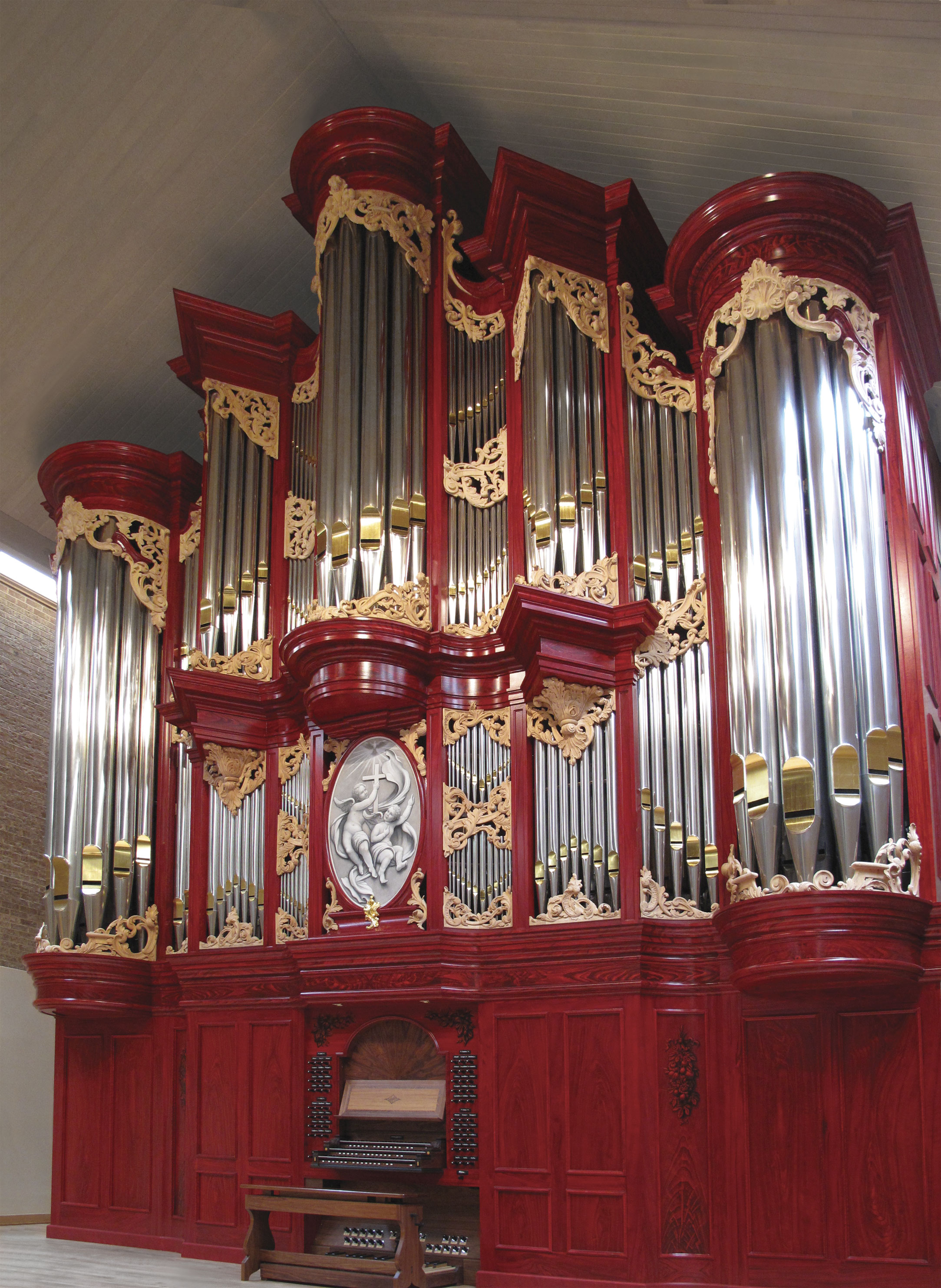 This organ takes advantage of a rear gallery placement with adequate height. The Great division speaks from the high central area with the Swell directly behind it. The Positive speaks from below, and in closer proximity to the choir. Four 16 foot stops on the manuals and 3 more independent 16 foot stops in the pedal give this organ ‘gravitas’ commensurate with the imposing case. The overall design is patterned after two Hinsz organs in Holland, with faux grained casework and baroque carvings to fill out the undulating façade of this instrument.